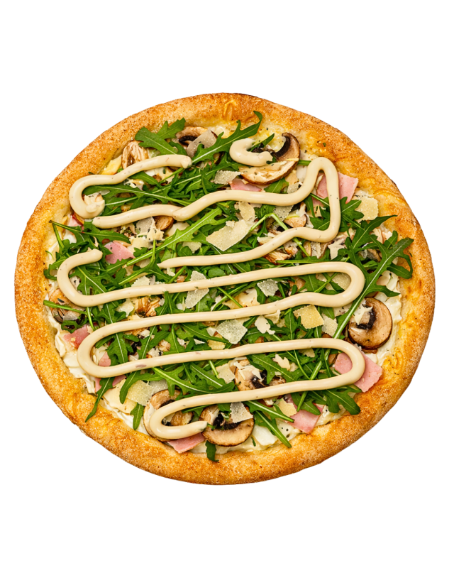 Frischkäsecreme, Schinken23, frische Champignons, Gouda, Rucola, Trüffelcreme