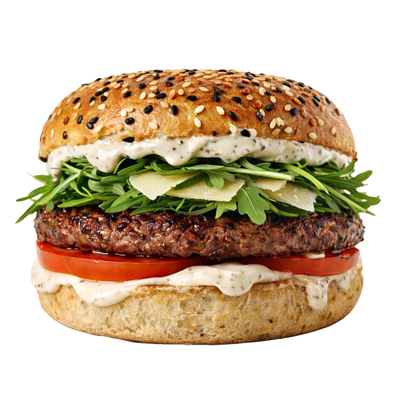 180g Angus Beef, Frischkäse, Tomaten, Salat, Trüffelcreme, Rucola, Parmesan