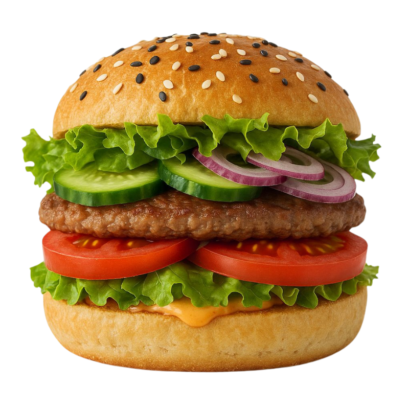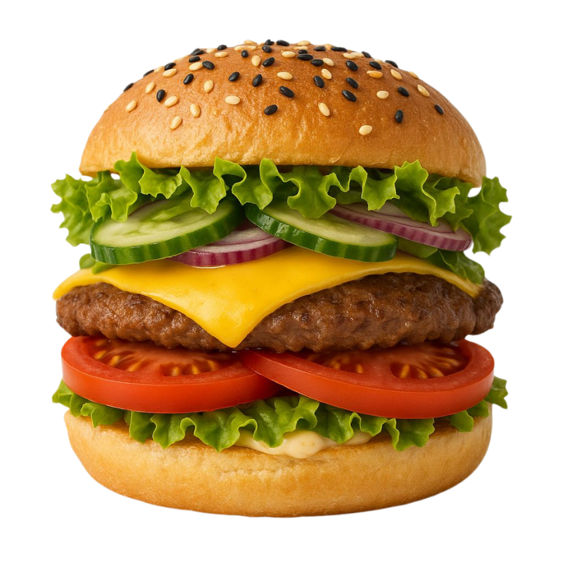 mit saftigem Rindfleisch, Zwiebeln, frischen Gurken, Tomaten, Salat, Cheddar-Käse1G und Spezial-Saucen12CJ