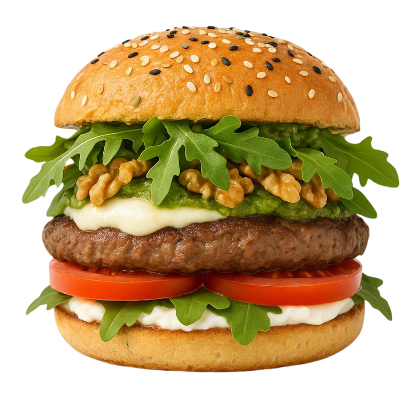 mit saftigen Rindfleisch, Tomaten, Rucola, Mozzarella, Walnüsse, Pesto und Frischkäsecreme