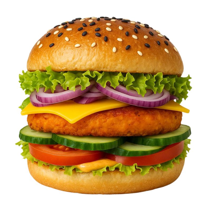 mit Süßkartoffel-Patty, Tomaten, frischen Gurken, Zwiebeln, Salat, Cheddar-Käse und Spezial-Saucen