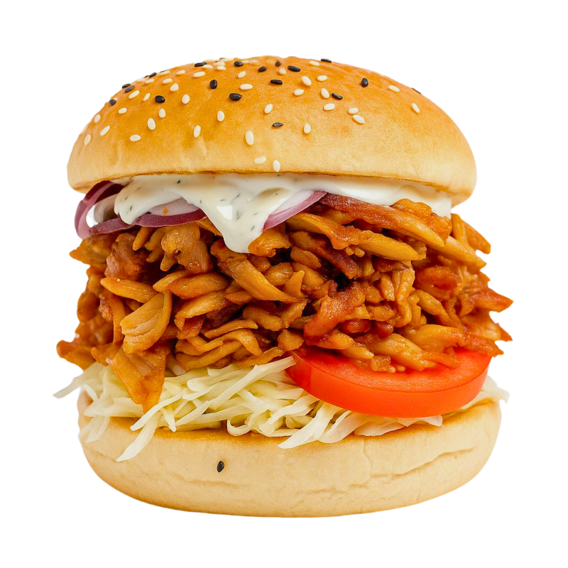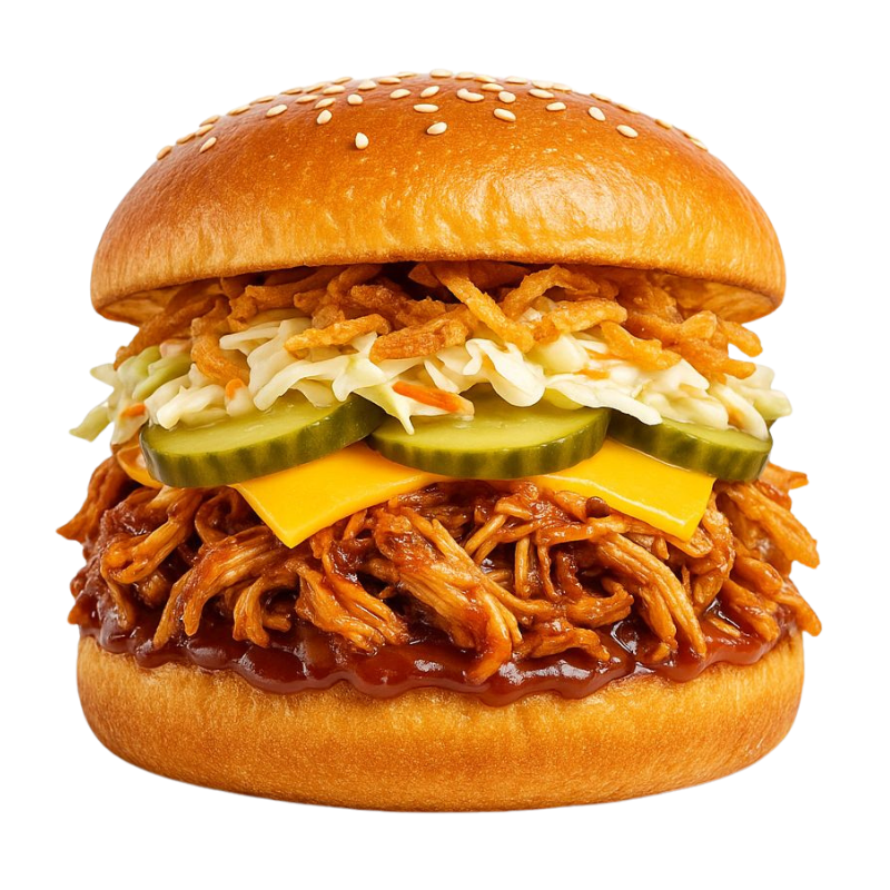 mit Pulled Pork (zartes Schweinefleisch), Sandwichgurken, Röstzwiebeln, Krautsalat, BBQ Sauce und Cheddar Käse