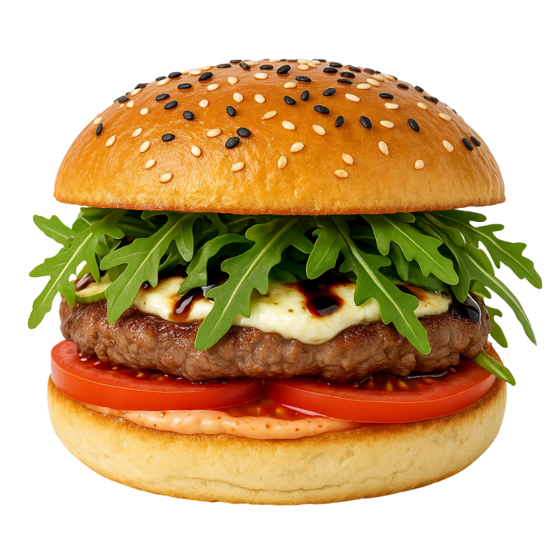 mit Brioche BrötchenA1 oder DinkelbrötchenA5, saftigem Rindfleisch, Bacon23, frischen Gurken, Tomaten, Salat und Sweet BBQ Sauce
