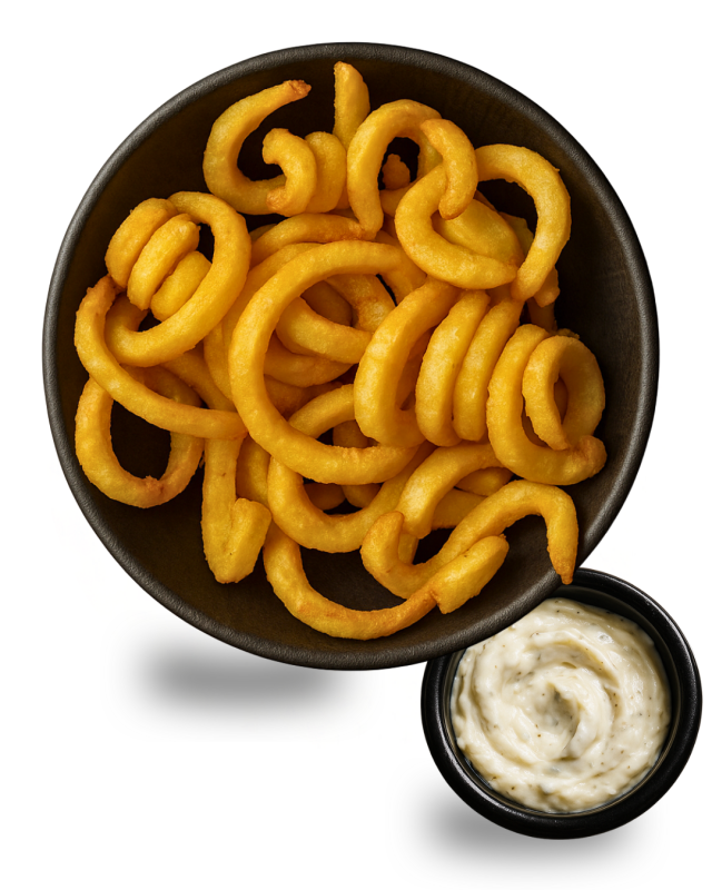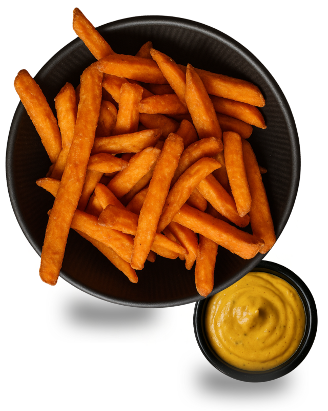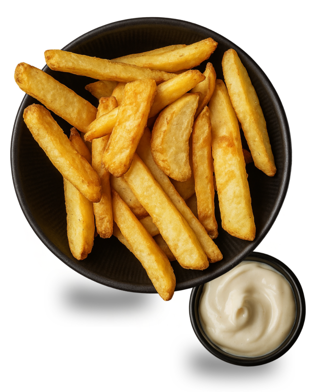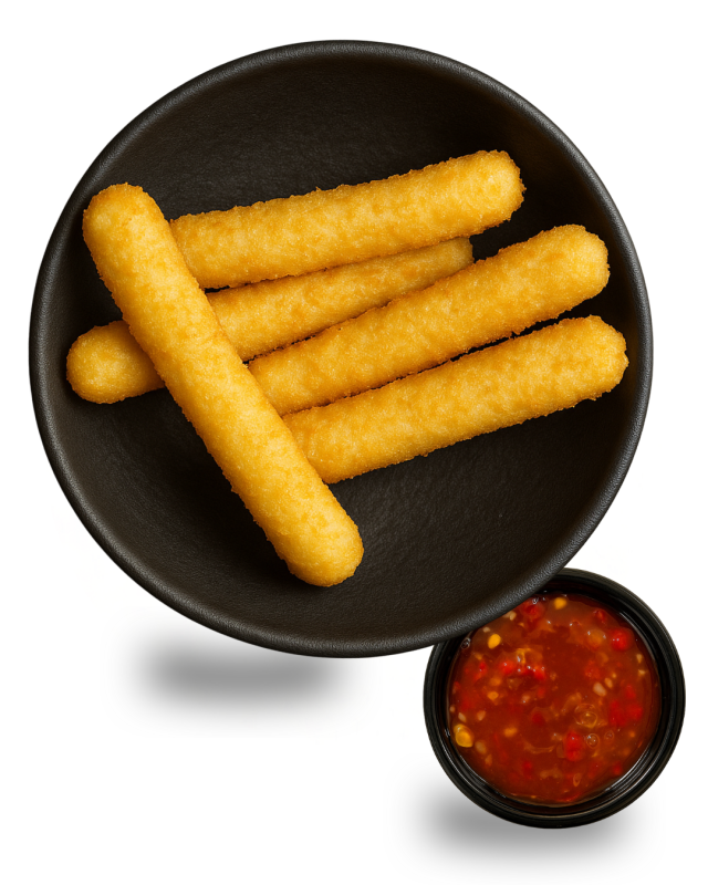 5 Stück leckere Mozzarella-StangenA11 aus echtem Mozzarella-Käse in knusprigem, gold braunem Bierteig, extra würzig mit Dip nach Wahl