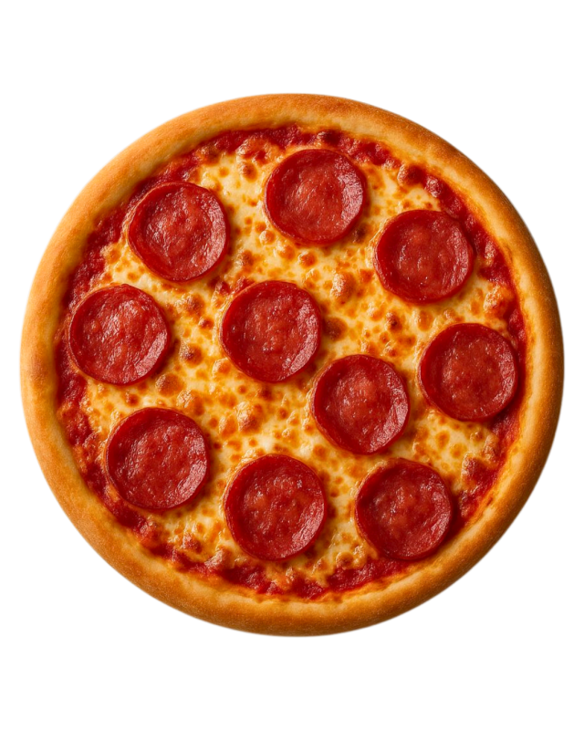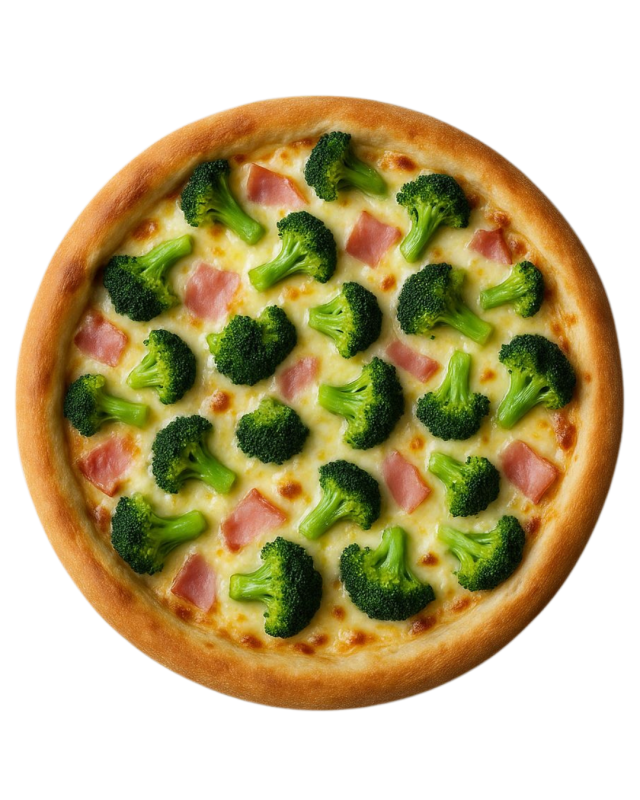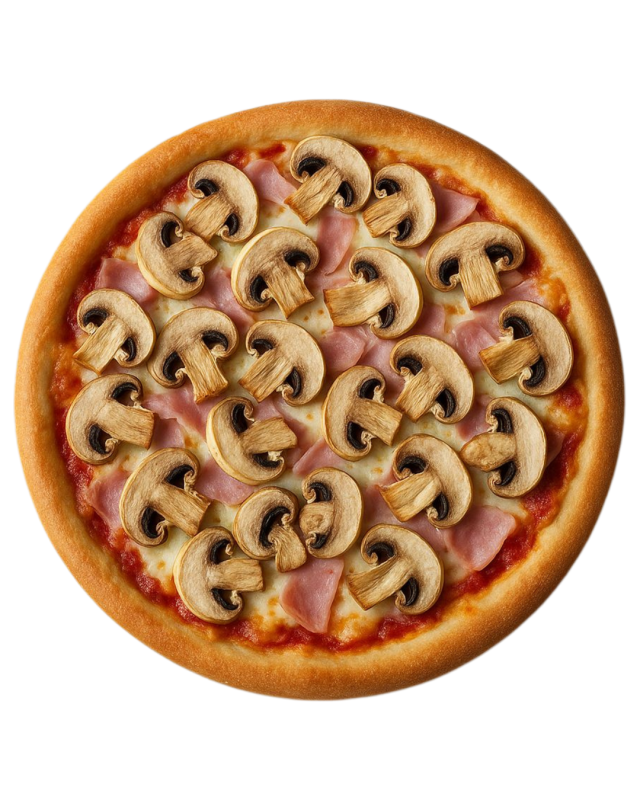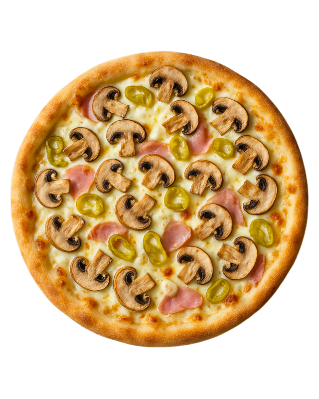 Knoblauchsauce2C, Schinken23, Peperoni mild29L, frischen Champignons, MozzarellaG, Gouda