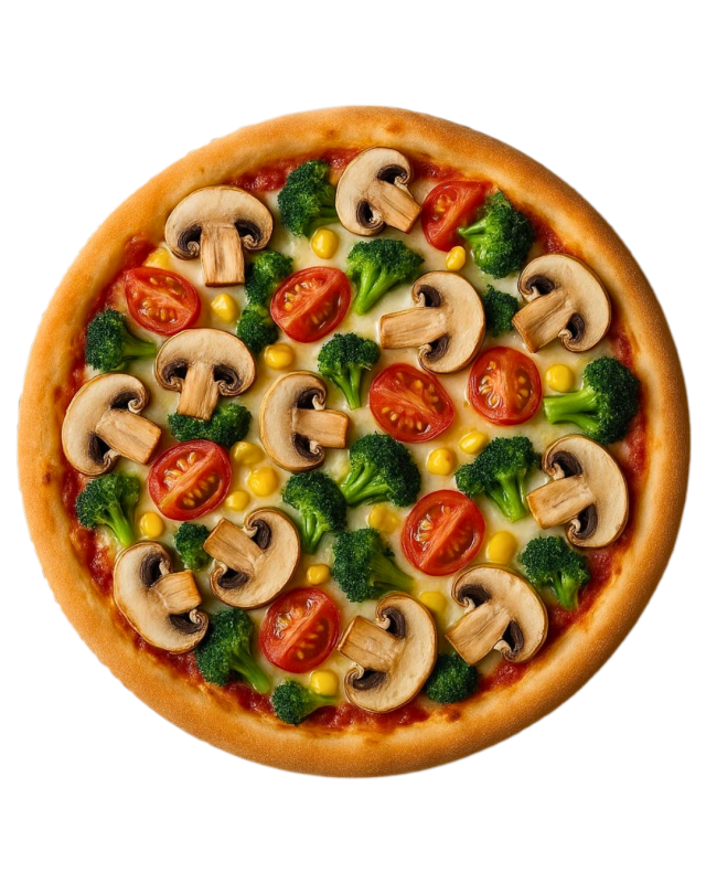 Tomatensauce, Broccoli, Mais, Cherry-Tomaten, frischen Champignons, Gouda