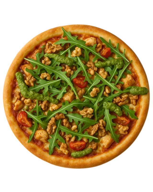 Tomatensauce, Hähnchenbrustfilet, Walnüsse, Cherry-Tomaten, Pestocreme, Rucola, Gouda