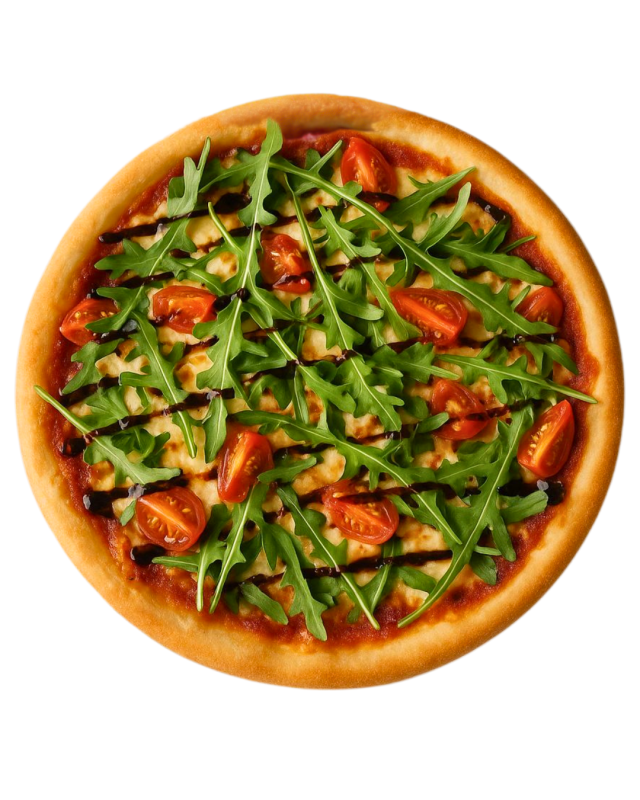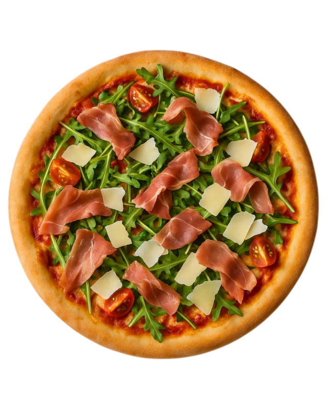 Tomatensauce, Serrano Schinken2, Cherry-Tomaten, Rucola, Parmesan2G, Gouda