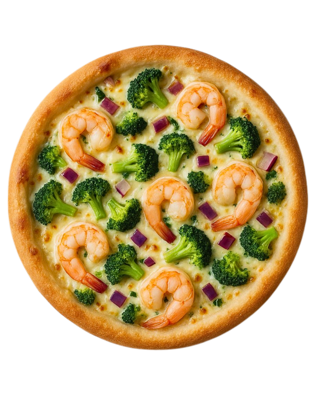Knoblauchcreme, Shrimps, Broccoli, rote Zwiebeln, Gouda