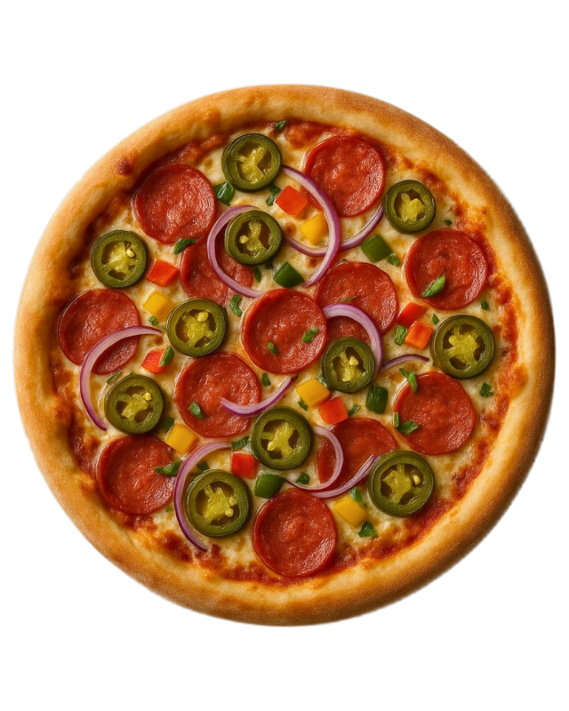 Tomatensauce, Knoblauchpürree, Zwiebeln, Peperonisalami23, Paprika, Jalapeños, Gouda